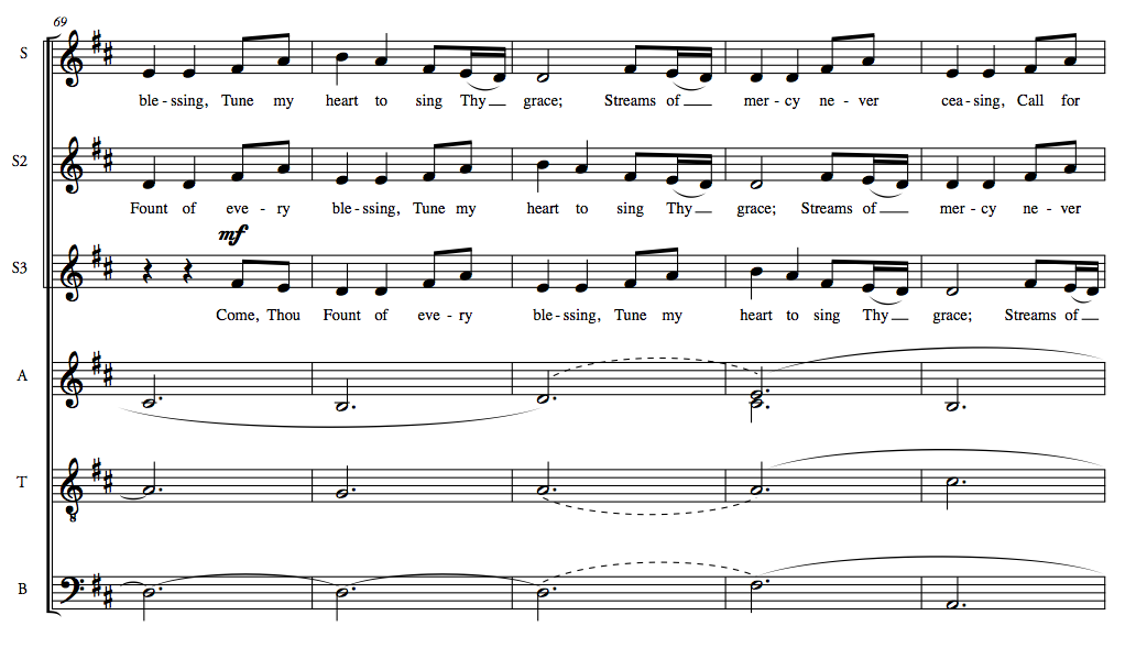 Come, Thou Fount of Every Blessing was arranged for the Beltones as my “senior solo” and was first performed in the ensemble’s spring concert on April 29th, 2011. It was also recorded on the group’s first recording, The Beltones, which can be listened to for free and purchased here. It was also performed by the Mills E. Godwin High School Madrigals in Henrico, Virginia.