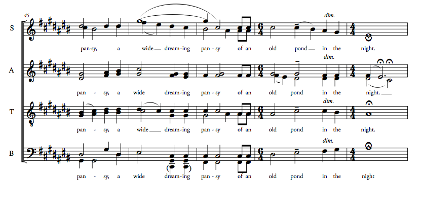 The anticipation in the vocal lines grow more intricate and strong as we begin to discover more about the journey of the “stuff of the moon.” Each destination of the moonlight is set in a distinct way, and when we finally arrive at the lake, the music becomes more consonant, yet doubles in power and emotion.