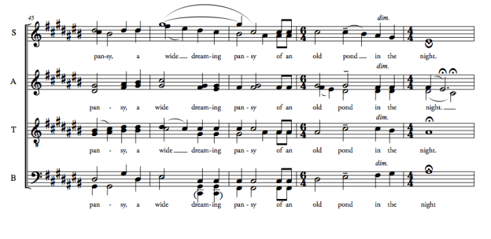 The flute serves as an audial representation of the “fluxions of yellow and dusk” shimmering on the water and shore, whereas the lush texture of the choir underneath it portrays the beauty and reverence of the sight.